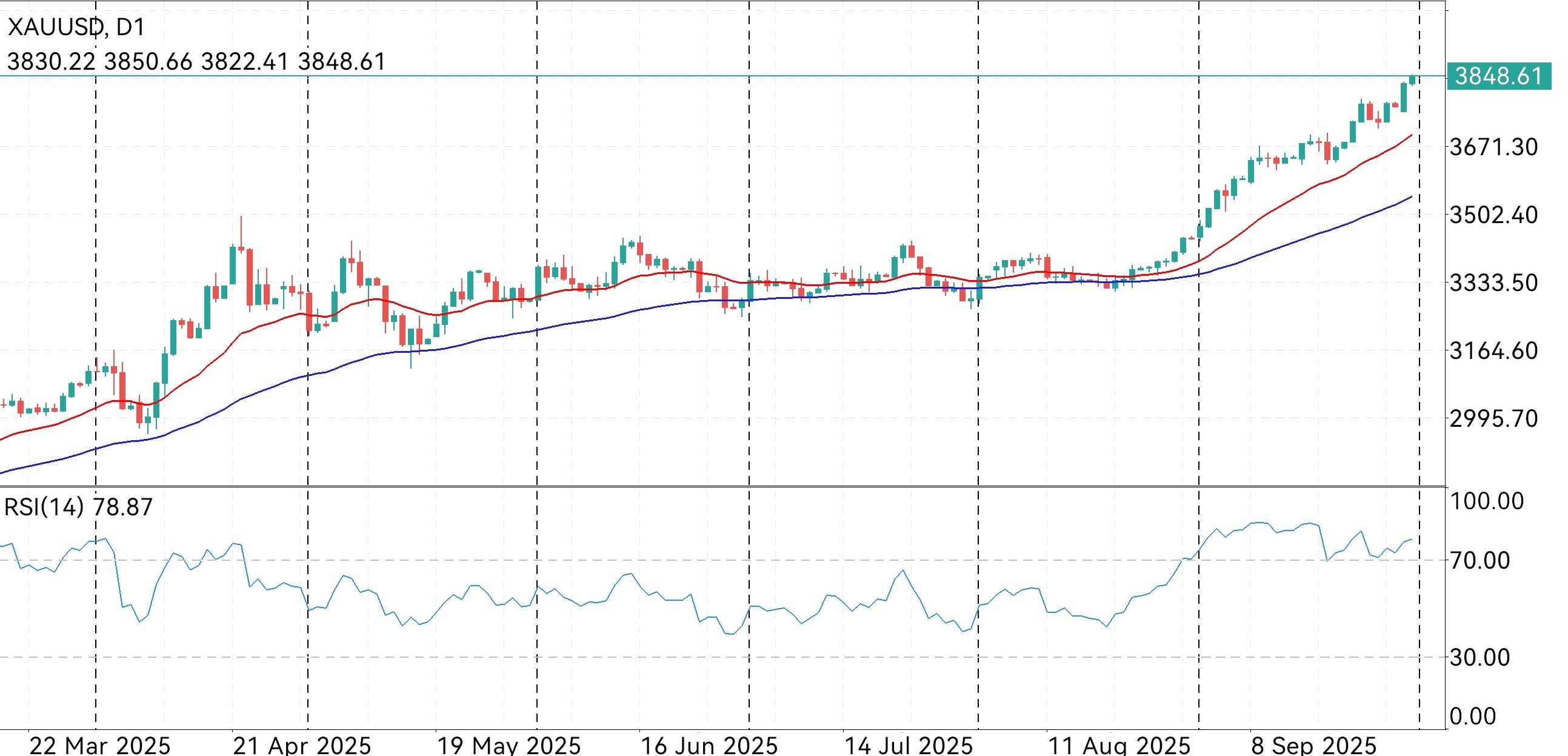 基本面:昨日,科技股支持三大美股指两连涨至一周高位,美债齐涨,十年期美债收益率四日内首度下行,美元指数继续跌离三周高位。美国政府停摆阴云助长避险情绪,黄金一度涨近2%、首次涨破3800美元;白银续创2011年来新高。