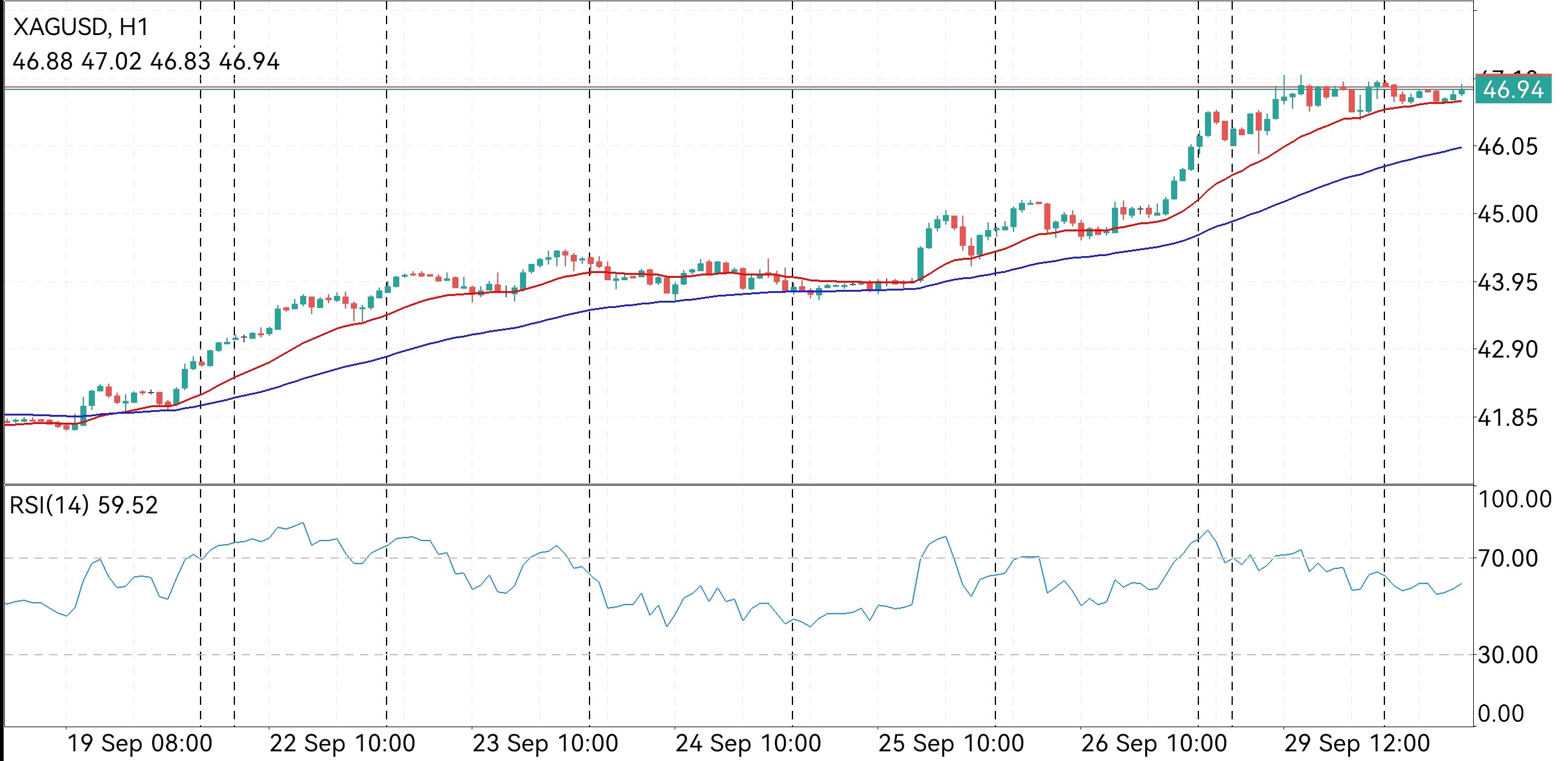 小时图上,昨日白银在开盘初期小幅回踩20EMA均线后继续震荡走高,但短线冲上47.00整数关口就,多头走势有所转弱,一直保持横盘震荡,但都维持在均线上方。今日白银在强势黄金的带动下,仍有新高机会,不过要小心冲高回落跌破20EMA均线的动作出现,一旦跌破20EMA均线,白银或将转入短线调整走势。届时要及时平多转震荡。