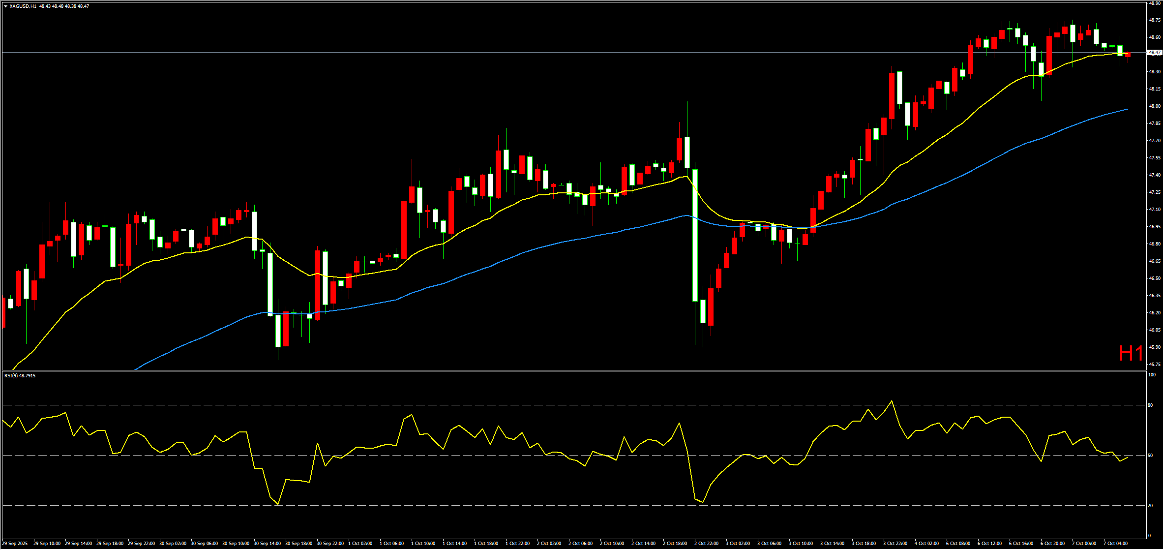小时图上,昨日白银在开盘后跟随黄金一同冲高,最高涨至48.75后遇阻回落,快速回踩20EMA均线支撑,随后转入均线上方震荡走势。短线形态上看,白银在日内高点附近遇阻转为震荡走势,短线20EMA均线是关键支撑,若跌破,则白银或将再度转跌,考验日线级别下方支撑。因此在操作上建议,先在均线附近逢低做多,若跌破均线,则平多转空。
