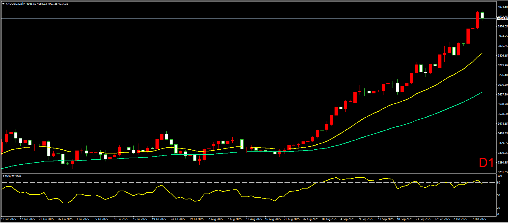 昨日,受美国政府继续关门影响,黄金日内如期继续强势上攻,直接突破4000美元大关,一度逼近4100美元,日线收带较为饱满的大阳线。整体形态上看,黄金继续强势走高,日内几乎涨幅接近100美金。不过,尾盘金价有所回落,目前日线呈带上下影的阴线形态,有回踩4000点整数关口的动作。预计日内先以高位震荡为主,等待均线上跟后再继续走高。