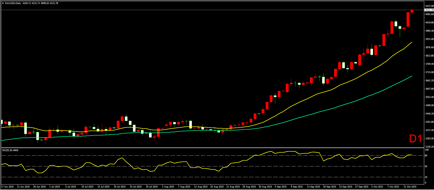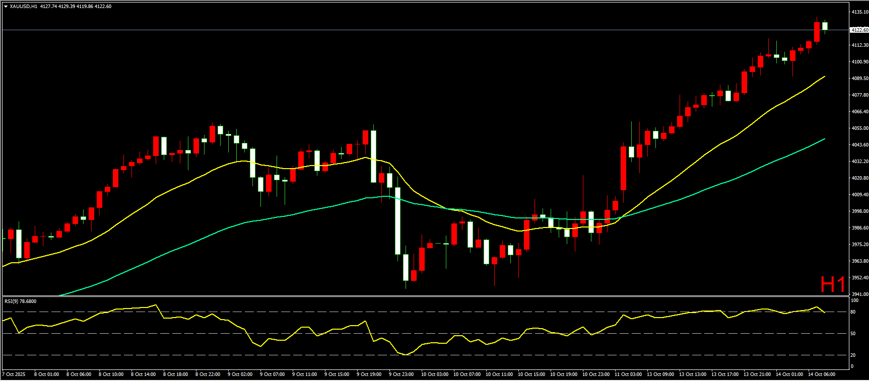 小时图上,昨日黄金从开盘阶段就快速走高,一路持续上行,盘中未有明显调整动作,日内狂彪超100美金。短线形态上看,黄金并未围绕均线震荡,而是更强势的向上突破,直接刷新历史新高,并站上4100美元,说明多头力量非常强劲,因此在日内操作上,建议先继续保持逢低做多为主,跟随趋势。
