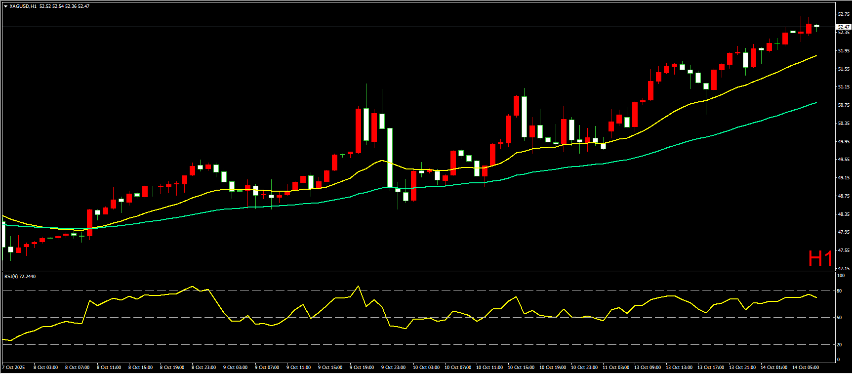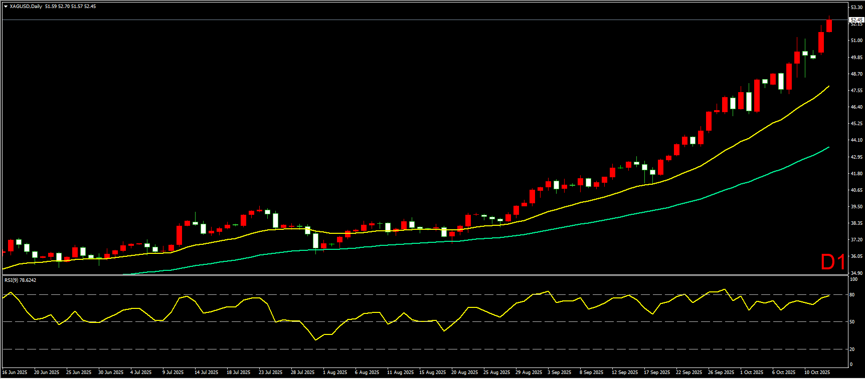 小时图上,昨日白银在从开盘阶段就快速冲高,突破此前双顶形态,刷新历史新高,并一路沿20EMA均线不断上行,目前最高涨至52.70附近。短线形态上看,白银突破双顶高点,结束调整走势,重新回到多头趋势,预计日内继续惯性上行,因此在操作上建议,先以均线附近做多为主。