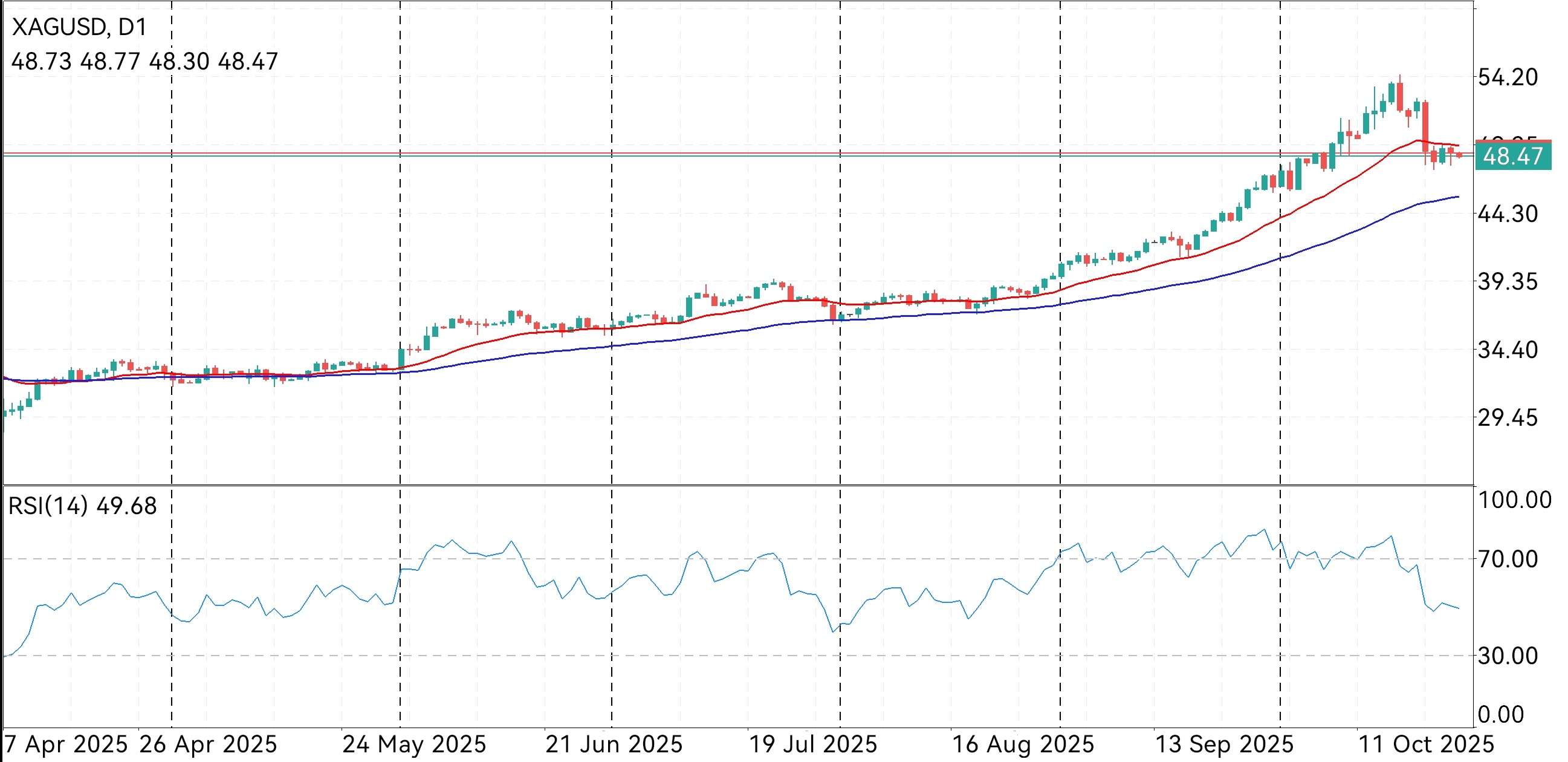 小时图上,上周五白银在开盘后受均线压制,逐步震荡回落至47.74附近才有所企稳,并在美国数据利多的刺激下再度回升至均线附近,但仍未突破均线压制。整体形态上看,白银受均线压制保持低位震荡,后市继续下行的概率较大,但RSI指标已回到均衡位置,要小心短线白银新低后快速反弹动作。因此在操作上建议,保持高抛为主,低多为辅的震荡操作。