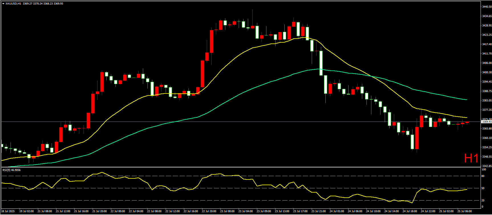 小时图上,昨日黄金跌破均线后未能回到均线上方,反而在小幅横盘后继续下挫,最低跌至3351附近才企稳回升。短线形态上看,黄金下挫后反弹仍受20EMA均线压制,日内走势震荡偏弱,短线震荡区间有所下移,日内大概率先在3355~3385之间震荡,因此在操作上建议,在区间上下沿做高抛低吸震荡操作。