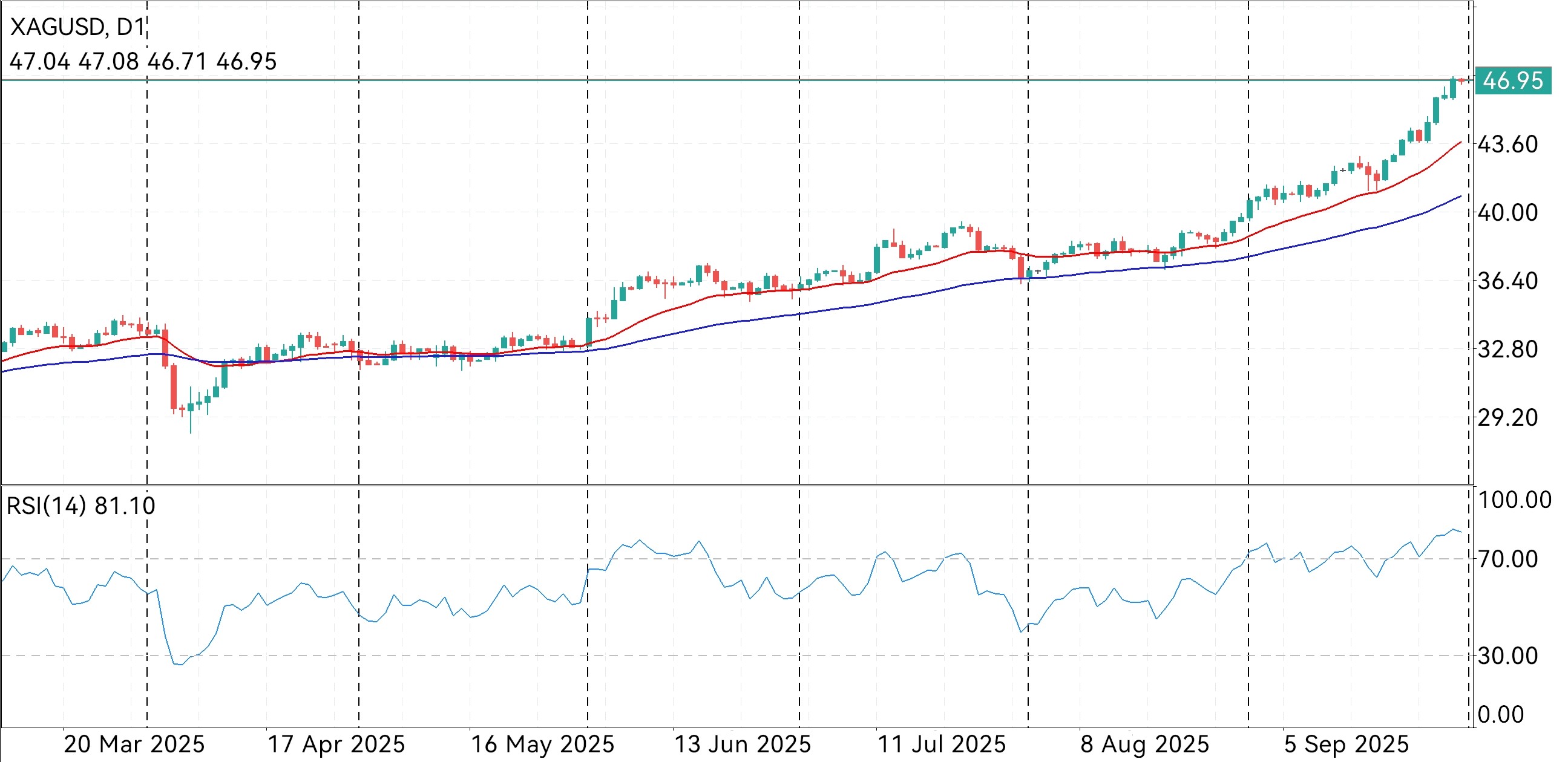 日线图上,昨日白银走势同样大涨,日线收较为饱满的大阳线,日线走出三连阳形态。整体走势上看,白银多头有明显向上加速的迹象,RSI指标严重超买,同时短线偏离均线较大,后市有震荡回踩或者横盘等均线上跟的情况。因此建议短信关注小周期形态,若出现短线头部信号,多单要及时止盈。