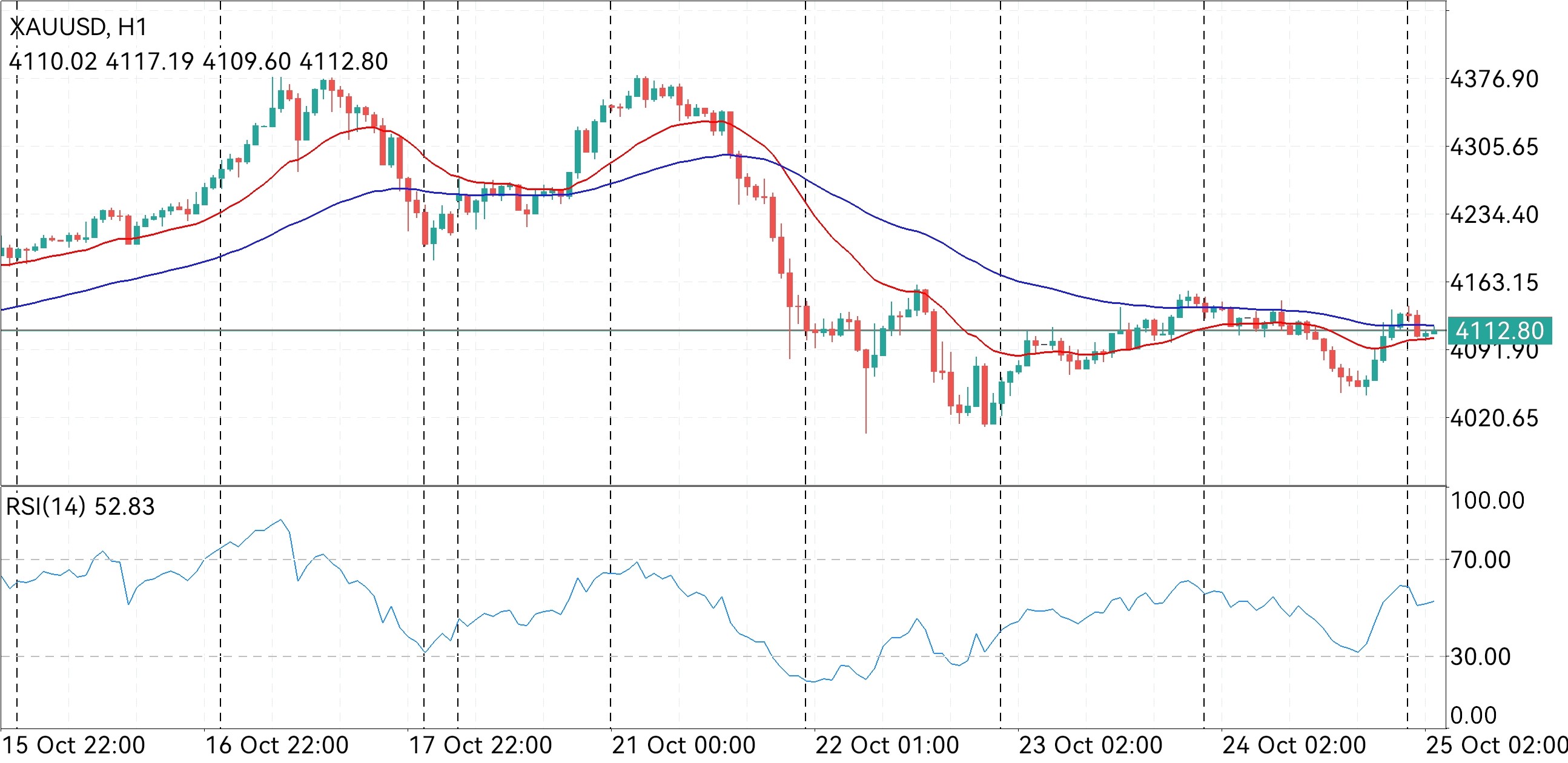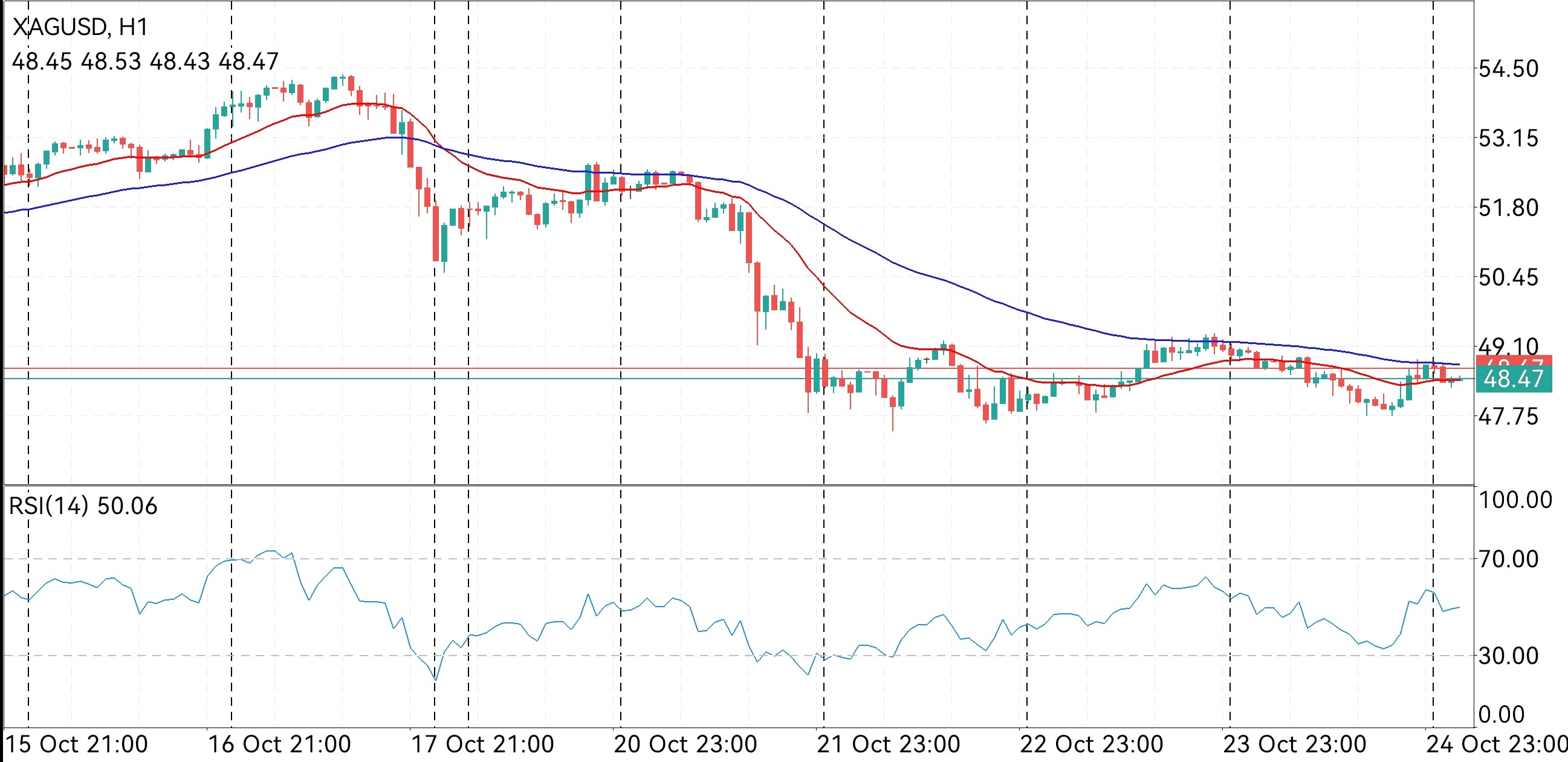 小时图上,上周五白银在开盘后受均线压制,逐步震荡回落至47.74附近才有所企稳,并在美国数据利多的刺激下再度回升至均线附近,但仍未突破均线压制。整体形态上看,白银受均线压制保持低位震荡,后市继续下行的概率较大,但RSI指标已回到均衡位置,要小心短线白银新低后快速反弹动作。因此在操作上建议,保持高抛为主,低多为辅的震荡操作。